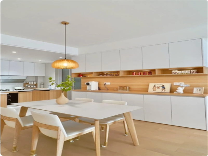 餐廚打通做成開放式設(shè)計,視覺上看起來整齊寬敞,在烹飪用餐時也能增多家人之間溝通